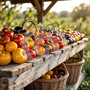 | "Colorful Heirloom Tomatoes at a Rustic Farm Stand â Fresh Organic Produce Display in Warm Sunset Light" |