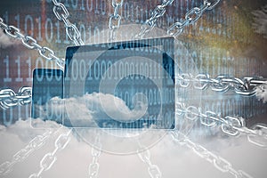 | 3d image of silver chain against clouds and binary coded computer screen |