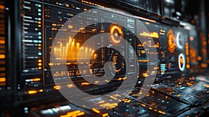 | A futuristic data analytics dashboard with interactive charts, statistics, and system monitoring features displayed on a digital interface |