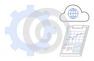 | Gear next to cloud computing symbol and data analysis tablet with checklists and graphs. Ideal for technology, process optimization, data management, cloud storage, networking, digital solutions |