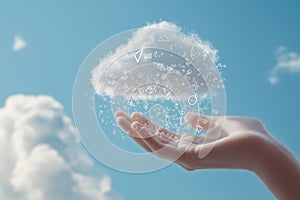 | generative AI image of a hand holding a digital file, uploading downloading data to the cloud. Concept of cloud computing, data storage and global network |
