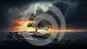 | The silhouette of a lone tree on a mountain ridge, with lightning flashes and dark clouds creating a dramatic backdrop. |