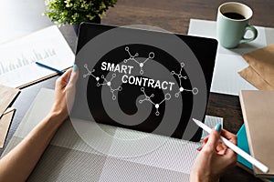 | Smart contract blockchain based technology concept on screen. Cryptocurrency, Bitcoin and ethereum. |