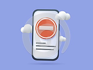 | 3D vector error notification, bug message on mobile phone with stop icon. no entry, problem, fail warning on application, alert for todo checklist. 3d forbidden icon vector render illustration |