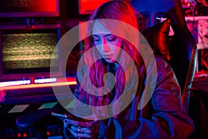 woman hacker asian wearing hood working computer and mobile phone |